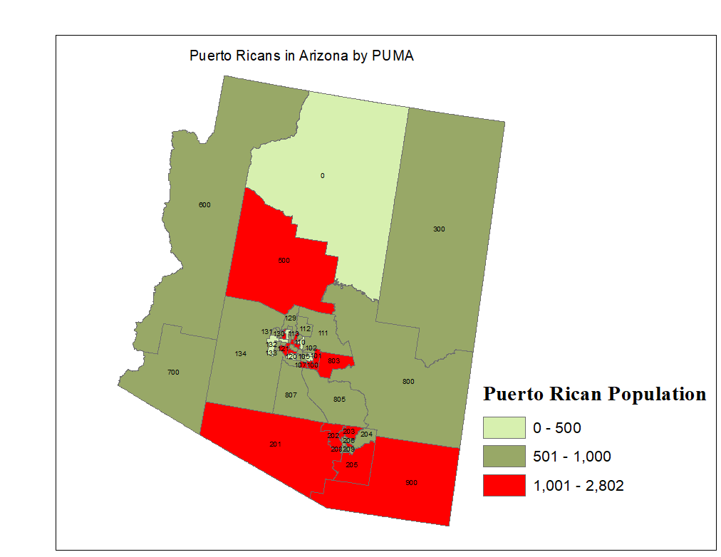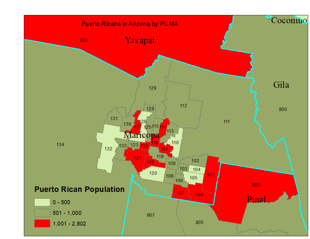 Within Maricopa County, there are at least 9 PUMAs with at least 1,000 Puerto Ricans each. One PUMA in Pinal county (803, Pinal County (North)--Apache Junction City PUMA ) has over one thousand Puerto Ricans, and it is contiguous with PUMAS 101(Maricopa County--Mesa City East) and 100 ( Maricopa County--Gilbert (South) & Queen Creek Towns PUMA, which also have over 1,000 Puerto Ricans.