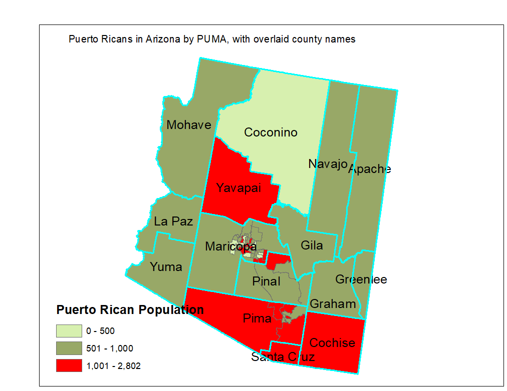 Although there are Puerto Ricans everywhere throughout the state, the overwhelming majority are concentrated in four counties. Maricopa County has 31,265, Pima County has 10,477, Yavapay has 1,080, and Yuma County has 815. The remaining counties have smaller populations which together add up to 6,102 boricuas throughout the state. The most detailed data gives information on the population by "Public Use Microdata Area" (PUMA), a unit whih is sometimes smaller than a county, sometimes larger than a county. For example, in less populous regions, such as Navajo and Apache counties, one single PUMA spans two counties, whereas inside the most populous counties, such as Maricopa, there are multiple PUMAS within the county. Due to this limitation in the data, I am reporting the population by PUMA.